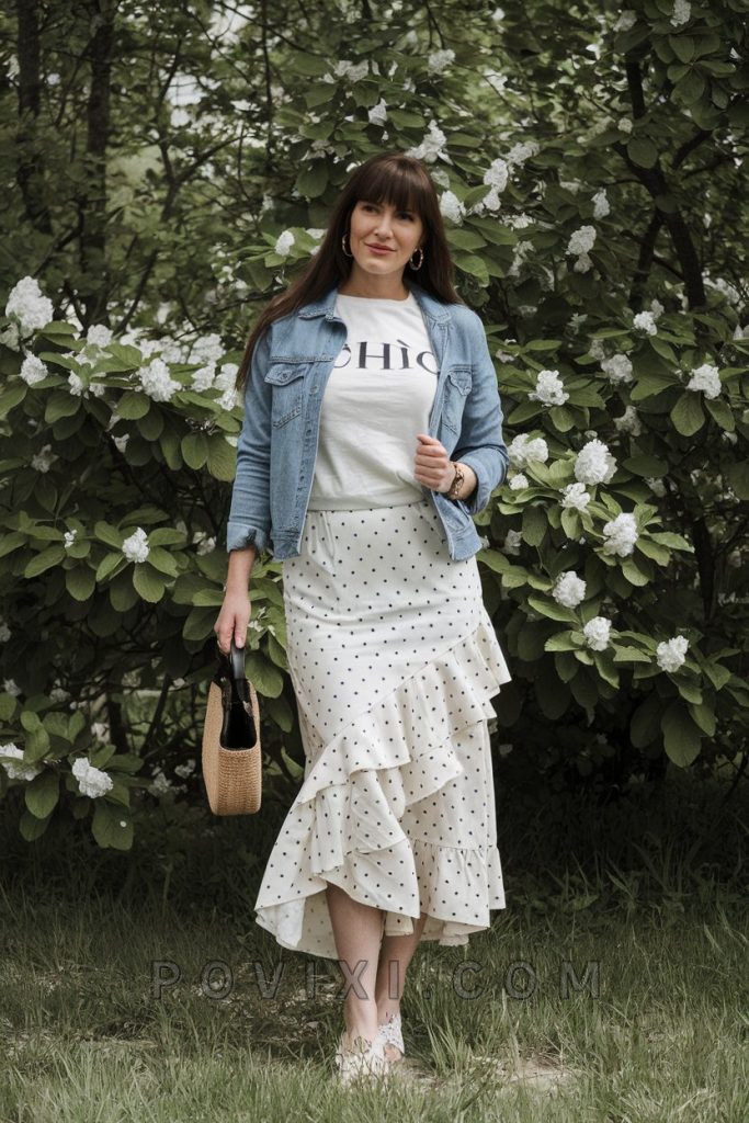 This outfit proves that denim jackets pair beautifully with long skirts. The high-waisted polka-dot skirt with asymmetrical ruffles adds movement, while the casual simple Korean aesthetic keeps it trendy. A tucked-in graphic tee adds a relaxed touch, making this look perfect for a day of exploring or grabbing coffee with friends. For a midsize or plus-size fit, opt for skirts with an A-line silhouette that elongate the legs. Great for city strolls, weekend brunch, or a day of shopping. The denim layer provides a touch of warmth for breezy summer evenings.
