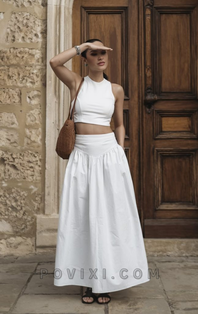 Nothing says summer sophistication quite like an all-white ensemble. A high-waisted, pleated maxi skirt pairs seamlessly with a sleeveless cropped top, creating an ethereal outfit ideal for vacations and sunset dinners. The oversized sunglasses and woven tote add effortless glamour to this free yet refined outfit theme. To elevate the look for an evening soirée, accessorize with silver statement earrings and metallic strappy heels.