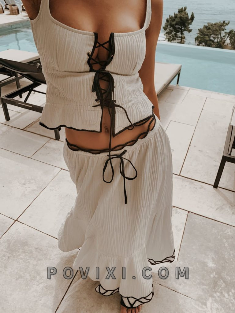 If you’re looking for no vip outfit ideas that channel a dreamy, carefree vibe, this ensemble is a must. The ruffled, off-white two-piece set features delicate black ribbon detailing that adds a whimsical, bohemian touch. The lightweight fabric makes it an ideal choice for tropical destinations or seaside escapes. Pair with minimalist sandals and dainty gold accessories for a polished yet breezy look. This outfit theme is a top contender for summer holiday plans.