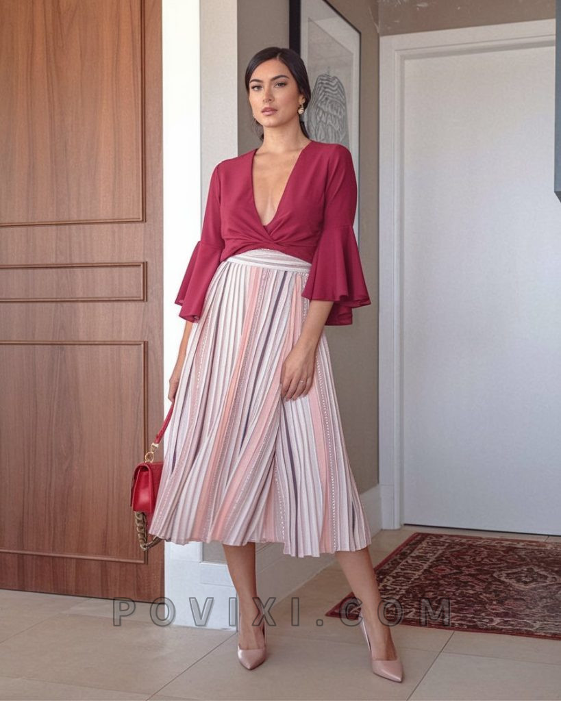 Nothing says confidence like a striking color-blocked outfit duo. The deep red wrap-style top paired with a pleated striped midi skirt creates a flattering silhouette that balances sophistication with playfulness. The choice of nude heels elongates the legs, making this a go-to for dinner dates or stylish work events. Carry a structured mini bag in a complementary shade, and opt for sleek hair to keep the focus on the brat-inspired boldness of the ensemble.