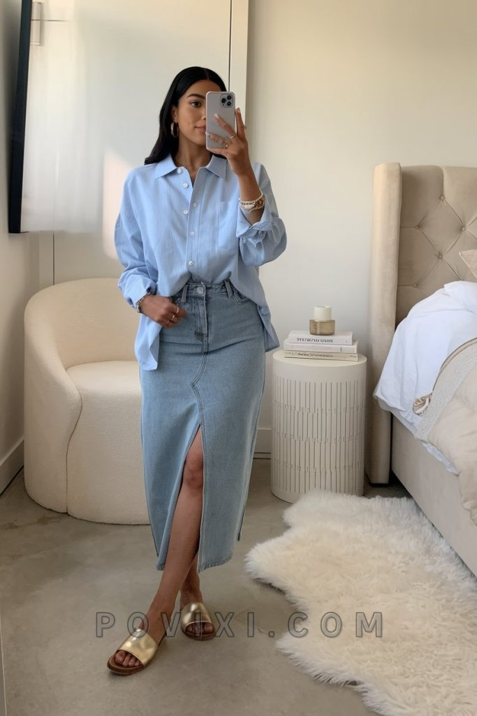Denim skirts are making a major comeback in 2025, and this look is proof that they can be both relaxed and refined. The high-waisted, front-slit denim skirt is paired with a crisp, oversized button-down shirt, effortlessly merging comfort with style. Flat sandals with gold buckle accents add a touch of casual chic, making this outfit an easy win for weekend errands or casual Fridays at the office. Roll up the sleeves of the shirt for a laid-back touch, and add a structured belt to cinch the waist if you prefer a more defined silhouette.
