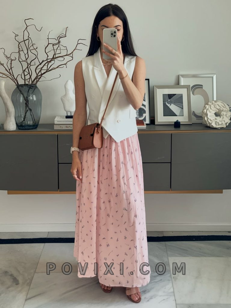 A pastel floral midi skirt combined with a structured vest top is the ultimate blend of modern minimalism and vintage romance. The soft pink tones exude a holiday-ready charm, while the structured vest keeps the outfit looking polished and contemporary. With delicate ballet flats and pearl accessories, this look is a fresh take on Parisian chic.