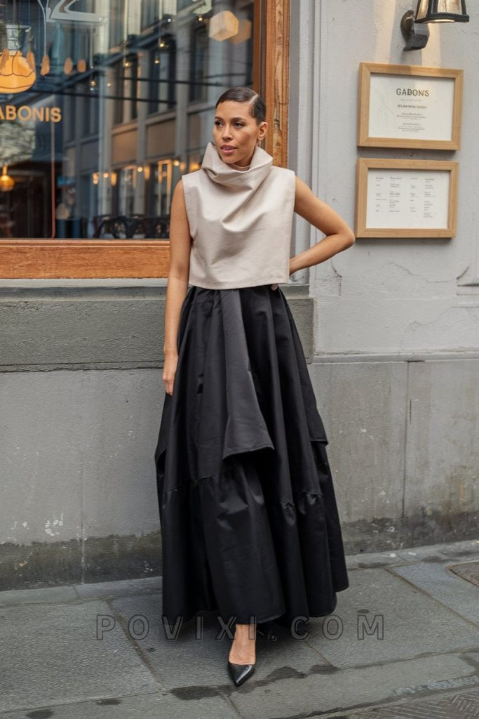 A flowing black maxi skirt is a wardrobe staple. When paired with a sleeveless beige top and pointed heels, the look is both modest and elegant—ideal for an evening dinner or city stroll. Add layered gold jewelry for a touch of luxury. Perfect for art galleries, fancy dinners, or rooftop gatherings.