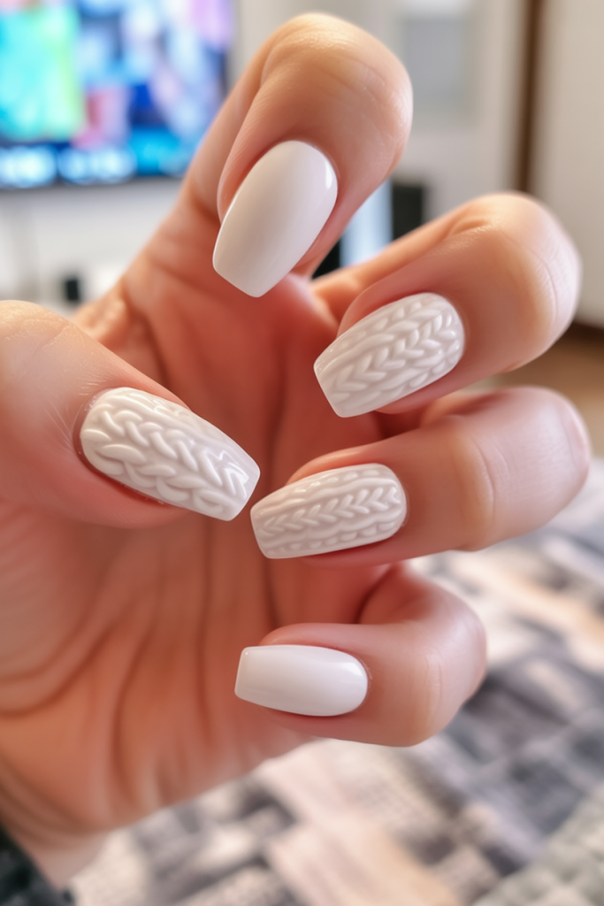 14. White Sweater Knit-Inspired Nails