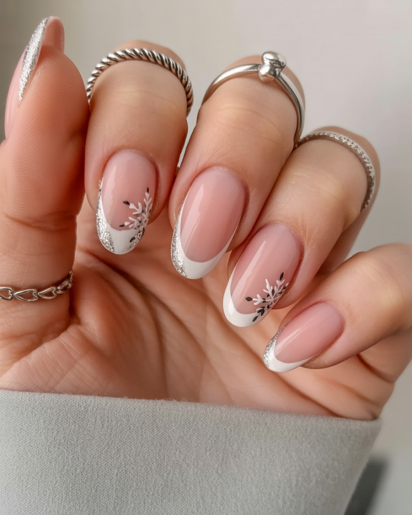15. French Tips with Silver Sparkle and Snowflakes