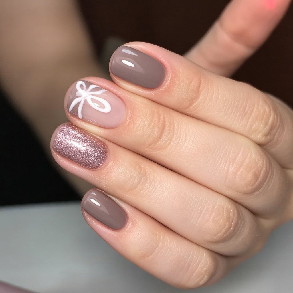 This art is especially good for short oval nails and can be done with gel DND or dip powder. Bow accents make it different but not loud, and the glitter balances off the muted hues. So-very-winter nail idea for ladies who want neutral fun design ideas.