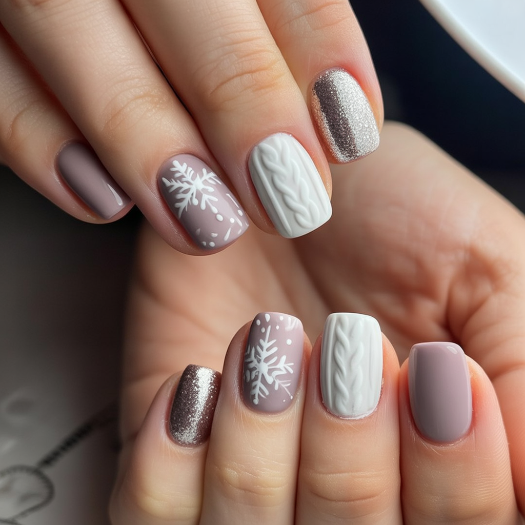 It feels like wrapping yourself up in your favorite winter sweater. Muted taupe shades with soft white details are all about that calm neutral appeal, while the snowflakes and knit texture give a cheeky seasonal vibe. That kind of manicure gives off winter charm but is just shy of being snobbishly chic.