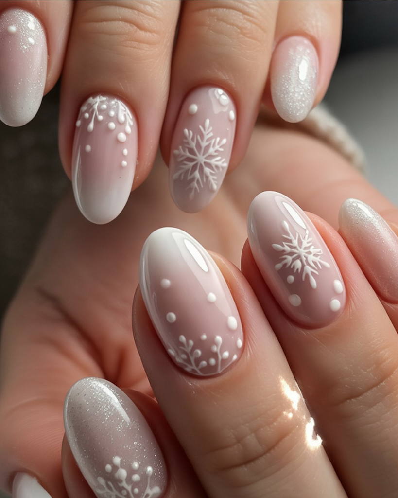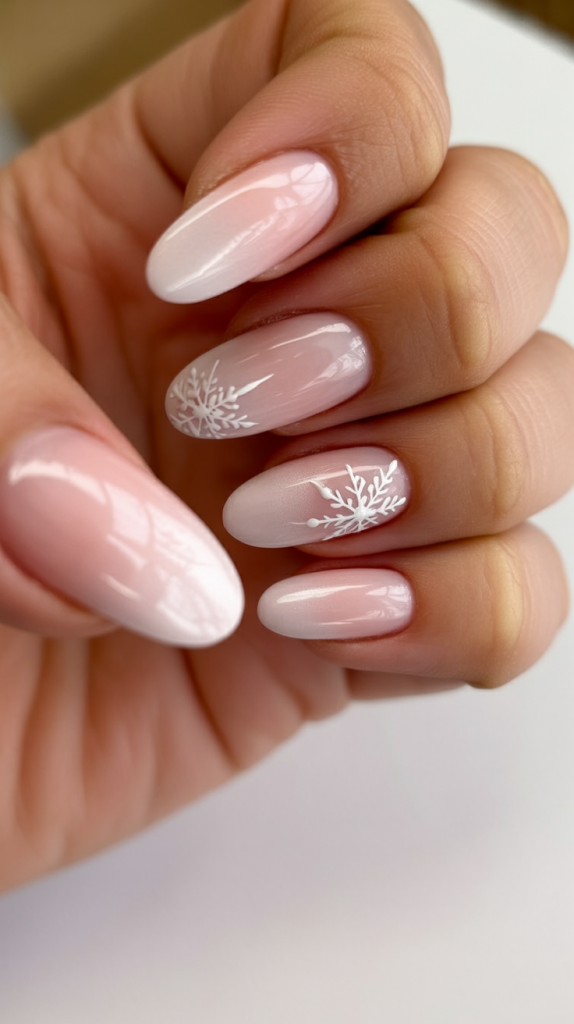 Delicate and feminine, these nails blend nude into soft pink for a frosty ombre effect. The snowflake details add seasonal charm without taking away from the simplicity of the design. It’s a manicure that feels romantic and fresh, perfect for winter days or holiday gatherings.