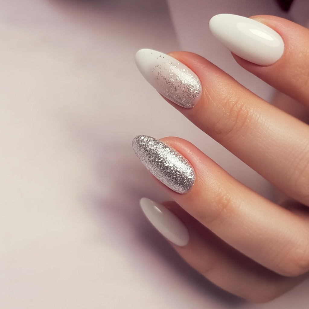 22. White and Silver Sparkle Nails