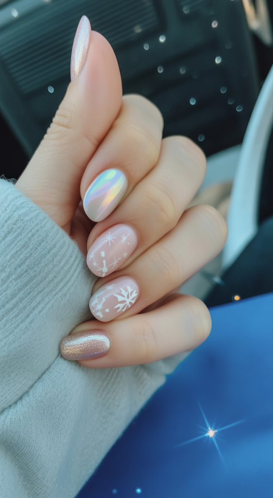 This manicure is like a little pin-up idea of winter thrown on your fingertips. The iridescent chrome nails shine with a rainbow light, whereas the sheer nude base decorated with delicate snowflake and star designs gives to the frosty dream-like feel. It can walk the goofy-elegant line-a perfect pairing for cozy evenings or all sorts of festivities.