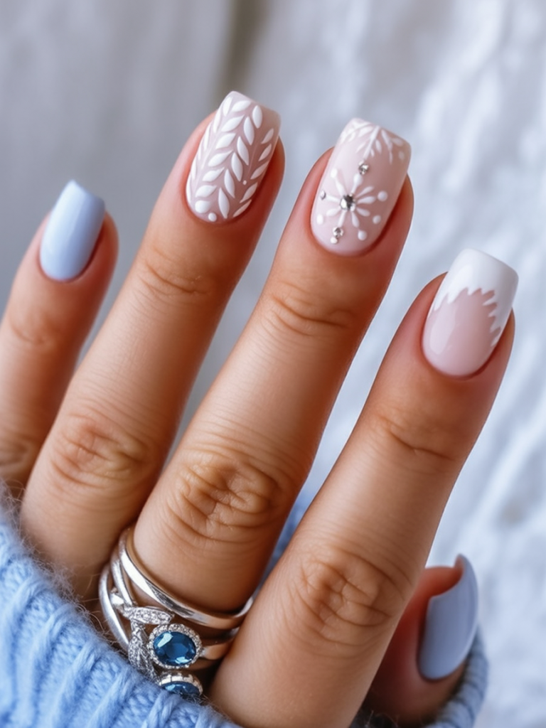 This manicure is like slipping into your favorite knit sweater. The soft pastel blues and pinks provide a frosty, delicate base, while the white embossed patterns and snowflake art add cozy charm. A touch of rhinestone sparkle keeps it modern and chic, making this design as stylish as it is seasonal.