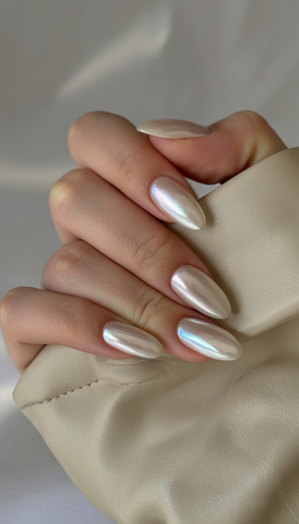 There’s something timelessly chic about a pearly sheen on perfectly shaped almond nails. The soft glow catches the light like silk, adding that quiet touch of sophistication you only see in understated luxury. This look is minimal yet full of presence, making it ideal for women who want to radiate polished elegance without going over the top. It’s the kind of aesthetic that whispers wealth instead of shouting it.