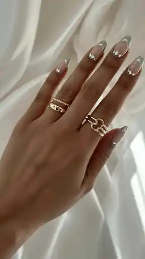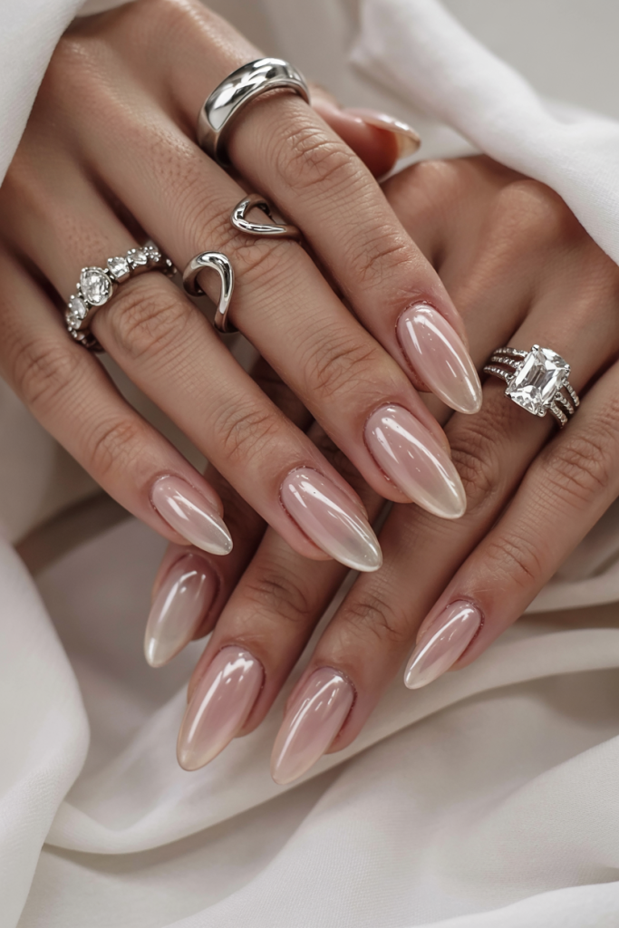 This manicure whispers luxury with its sheer nude tones and glassy shine, creating an effect that feels timeless and graceful. Paired with elegant silver jewelry, the nails exude quiet sophistication, the type of style you’d expect to see at a refined dinner or a chic weekend brunch.