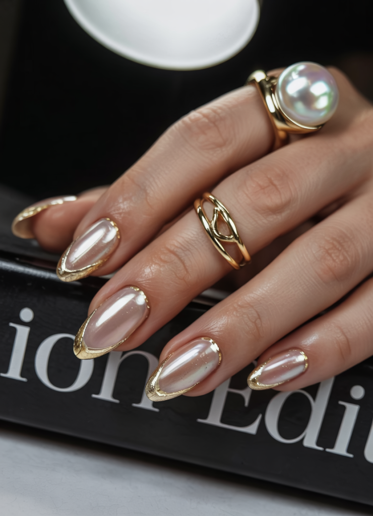 Gold accents outlining a pearly base give these nails a regal, jewelry-like effect. They almost look like wearable art, reflecting both glamour and restraint in the same breath. This design perfectly embodies the old money aesthetic—classic with just a touch of statement sparkle.