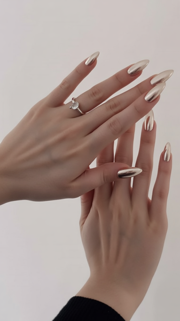 Chrome nails bring a futuristic yet refined touch, and in this soft metallic shade, they radiate quiet confidence. They feel like a modern interpretation of luxury, catching the light in a way that’s sleek without being overdone.