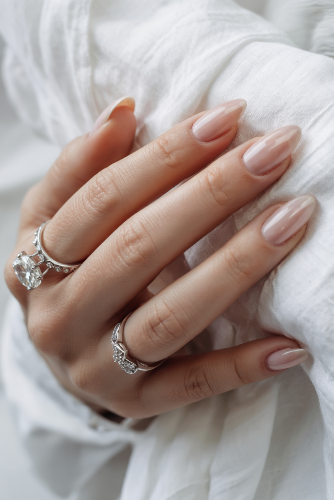 These nails are best suited for almond shapes, making them flattering on most hands. The glossy nude is perfect for women who want something neutral that still feels special. It’s also practical, as the natural base makes regrowth less noticeable, allowing for longer wear between salon visits.