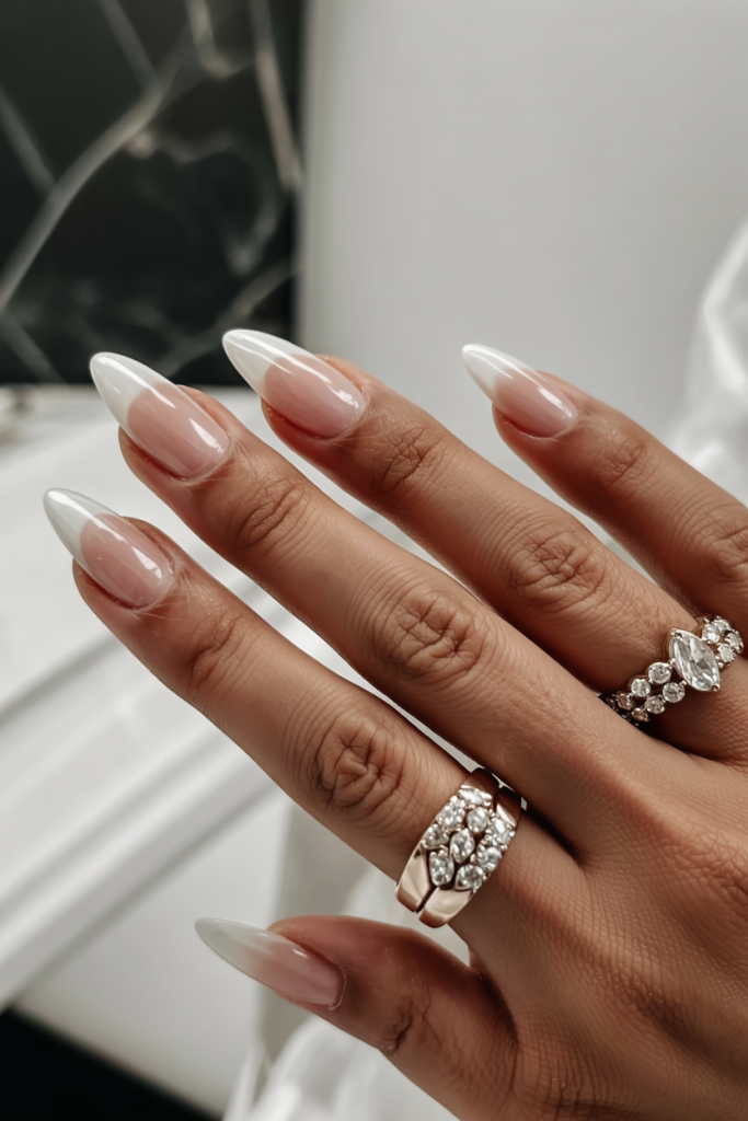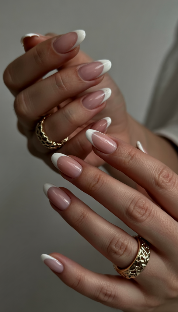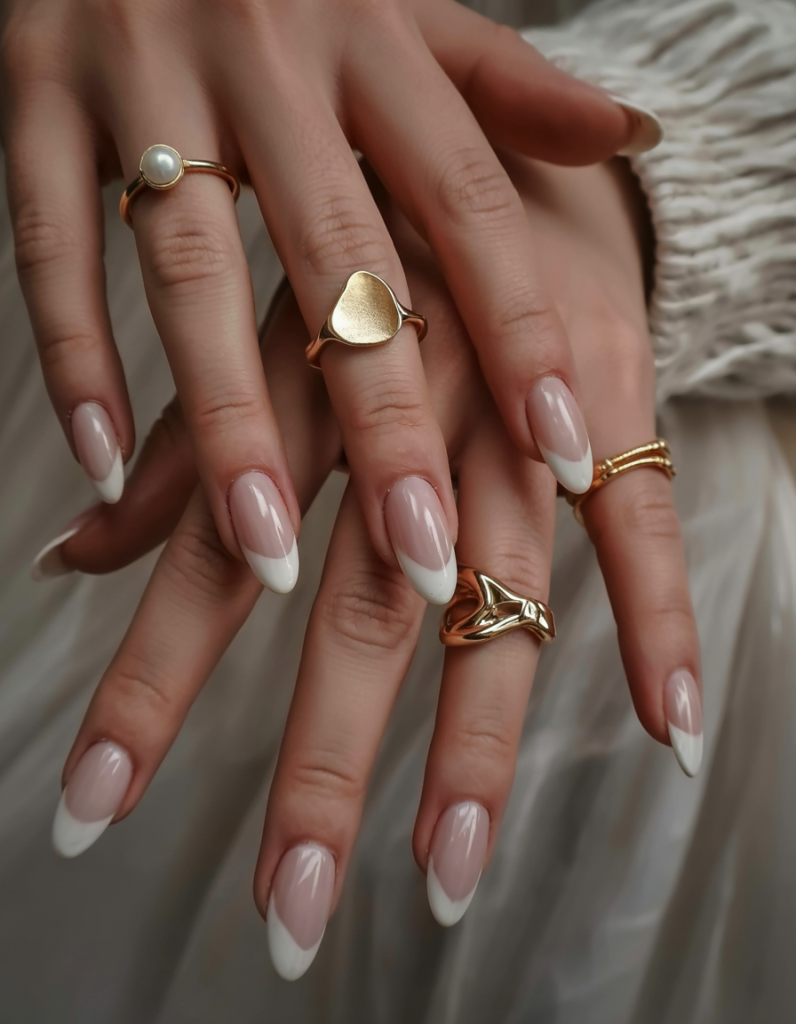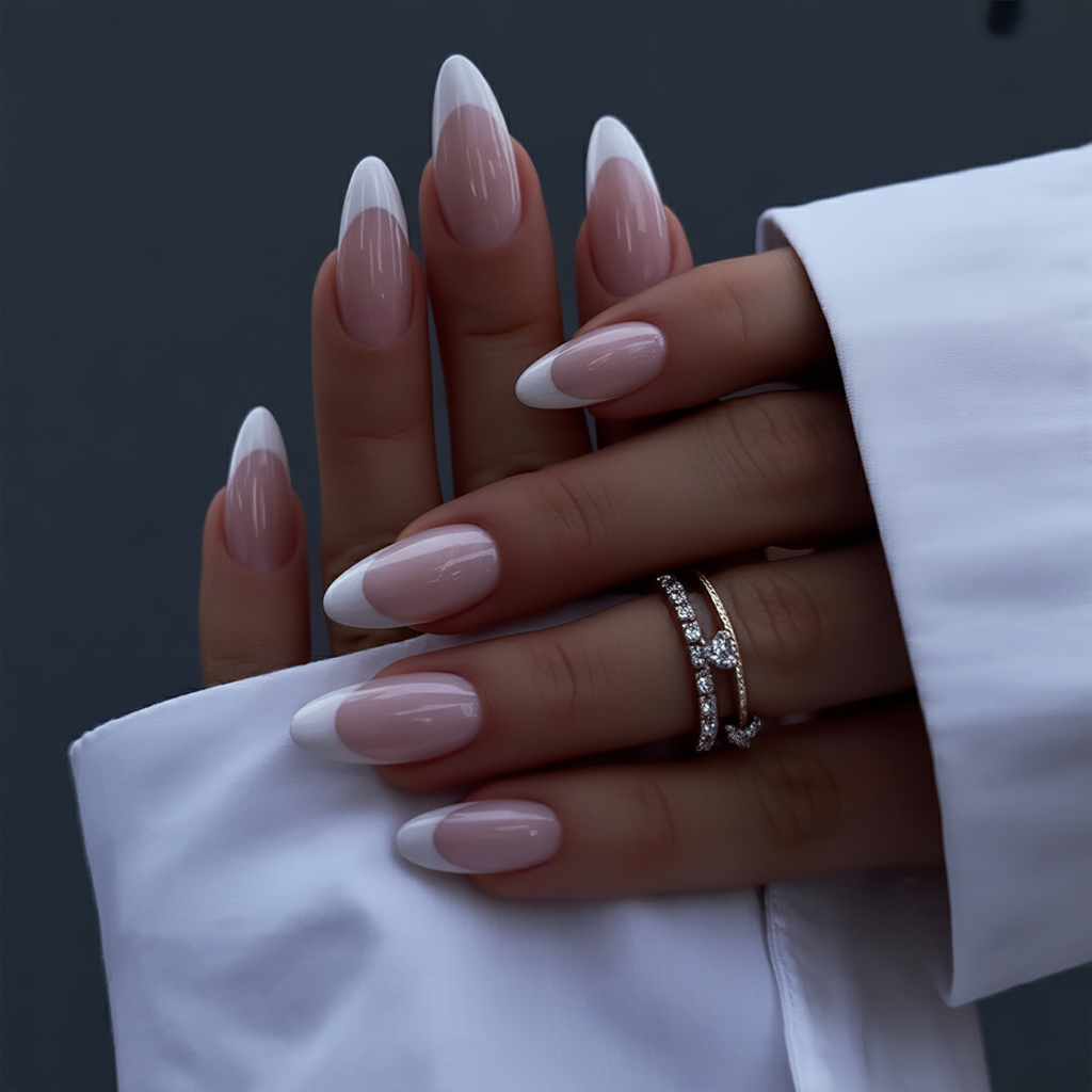 Crisp white tips against a soft pink base create a manicure that’s as timeless as pearls. On almond-shaped nails, the French manicure feels more fluid and graceful, giving it a refined twist that never goes out of style.