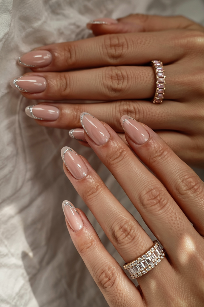 Nude nails with a delicate silver outline strike the perfect balance between subtle and glamorous. This design feels chic and polished, with just enough sparkle to draw attention without overpowering. It’s the kind of manicure that feels at home at a wedding, a dinner party, or even a simple weekend outing.