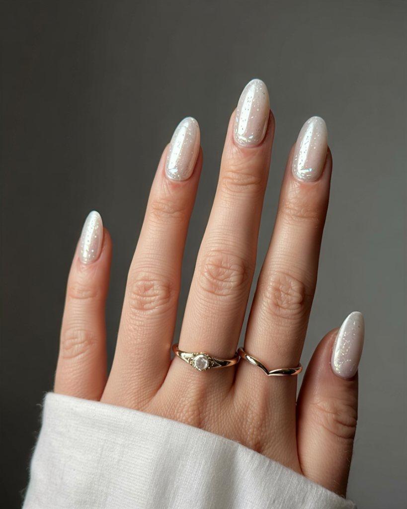 These nails shimmer with a pearly white glow, offering a fresh and almost ethereal feel. The tiny iridescent flecks catch the light beautifully, giving the design a soft, playful edge while still keeping it sophisticated.