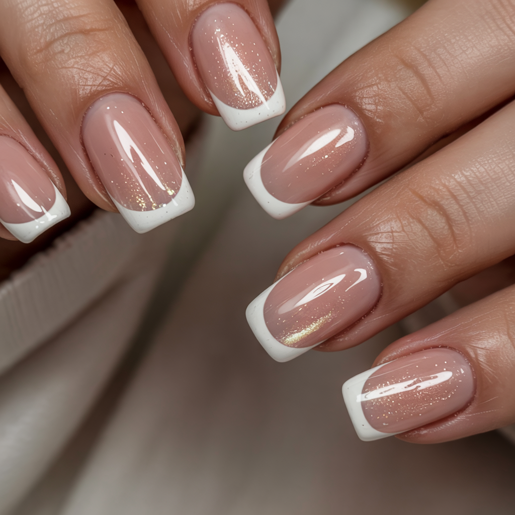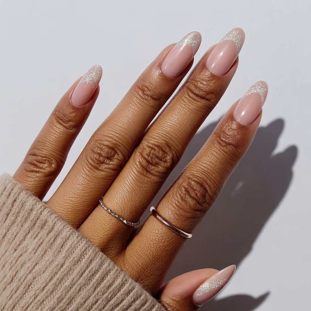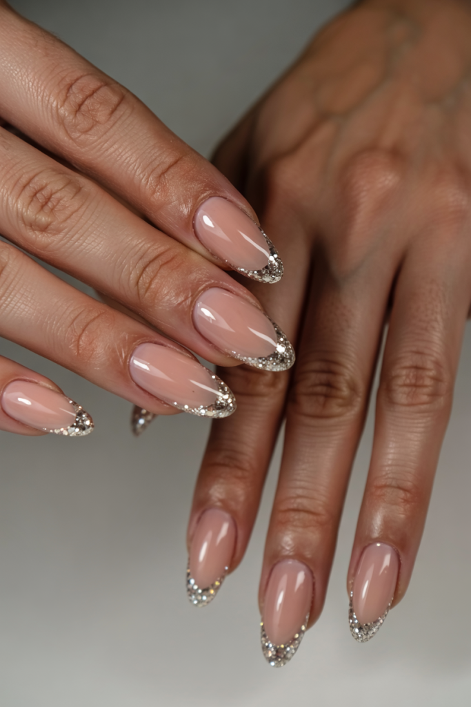A nude base with glitter-dusted tips brings sparkle in the most refined way. The design is festive without being over the top, catching light with every movement and elevating the manicure into something truly elegant.