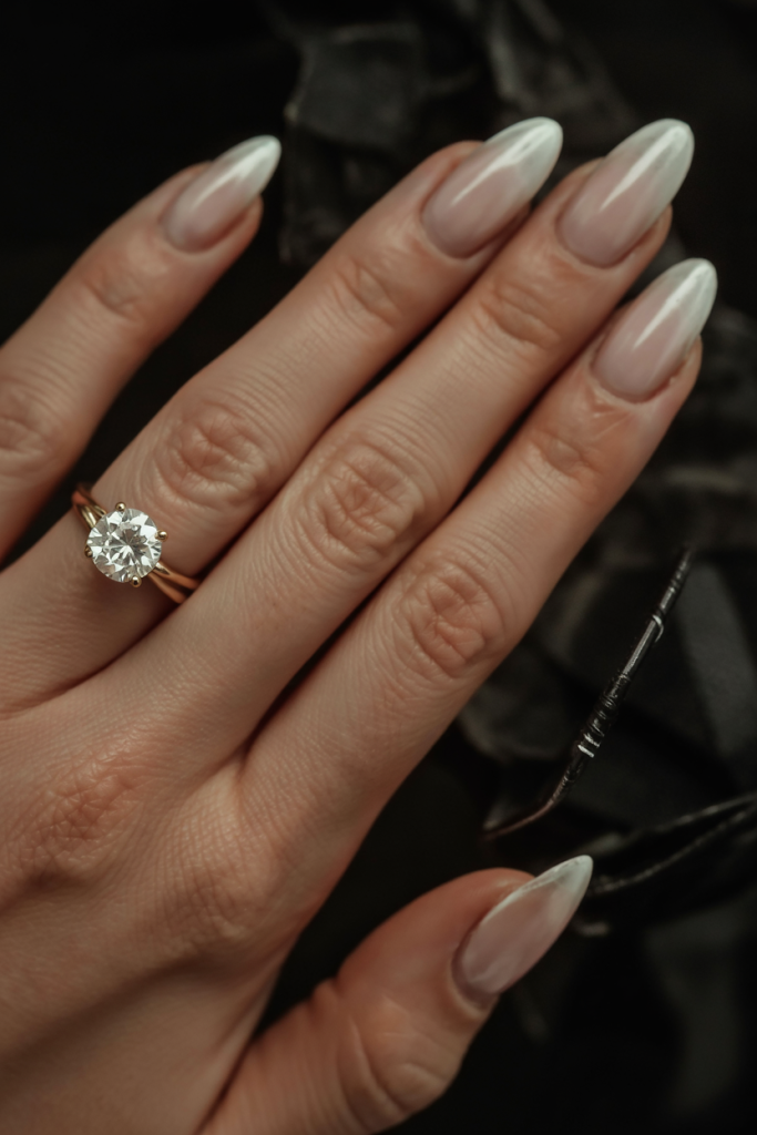 A soft wash of white with a pearly glow gives these nails an almost angelic charm. They feel fresh and polished, the kind of manicure that instantly makes your hands look well-groomed and refined. The effect is subtle but still luminous, perfect for quiet luxury.
