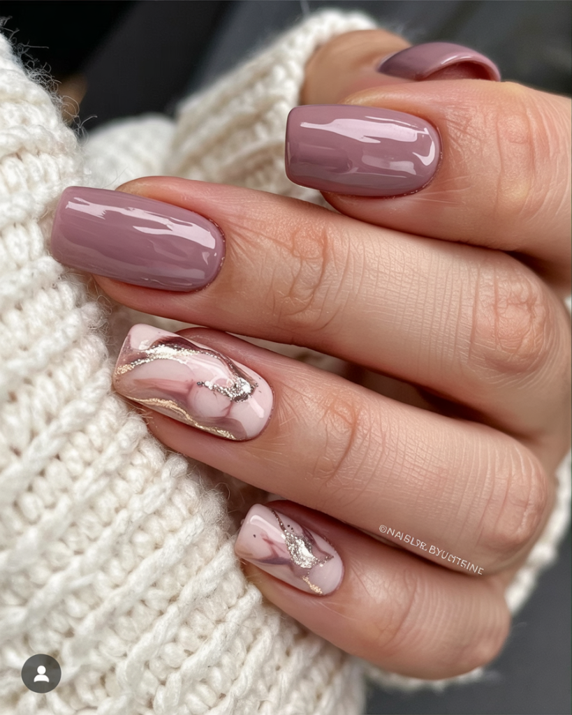 It is a look of taking your hands wrapped in a collection knit sweater with a hot beverage on a cool fall day. The main nails are in an mauve shade that allows building a comfortable base and using the accent nails that have a marble-like effect and a flowing brushstroke including some glitter and being made in very soft lines that remind the changing leaves. It is romantic, relaxing, and quite luxurious the set that you would wear on a relaxing trip in fall with your friends.