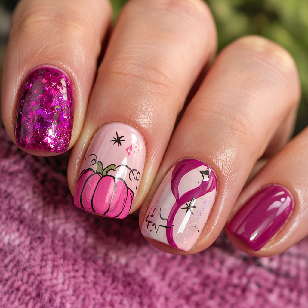 There is no reason not to play a bit longer with your fall manicure. This humorous decoration brings the pink to a new extreme with the use of strong glitter, cartoon pumpkins as well as abstract decoration art. It is colorful and classicoular and very much like a fall-fest of your fingertips. This is perfect when you are longing to see people smile because of your nails.