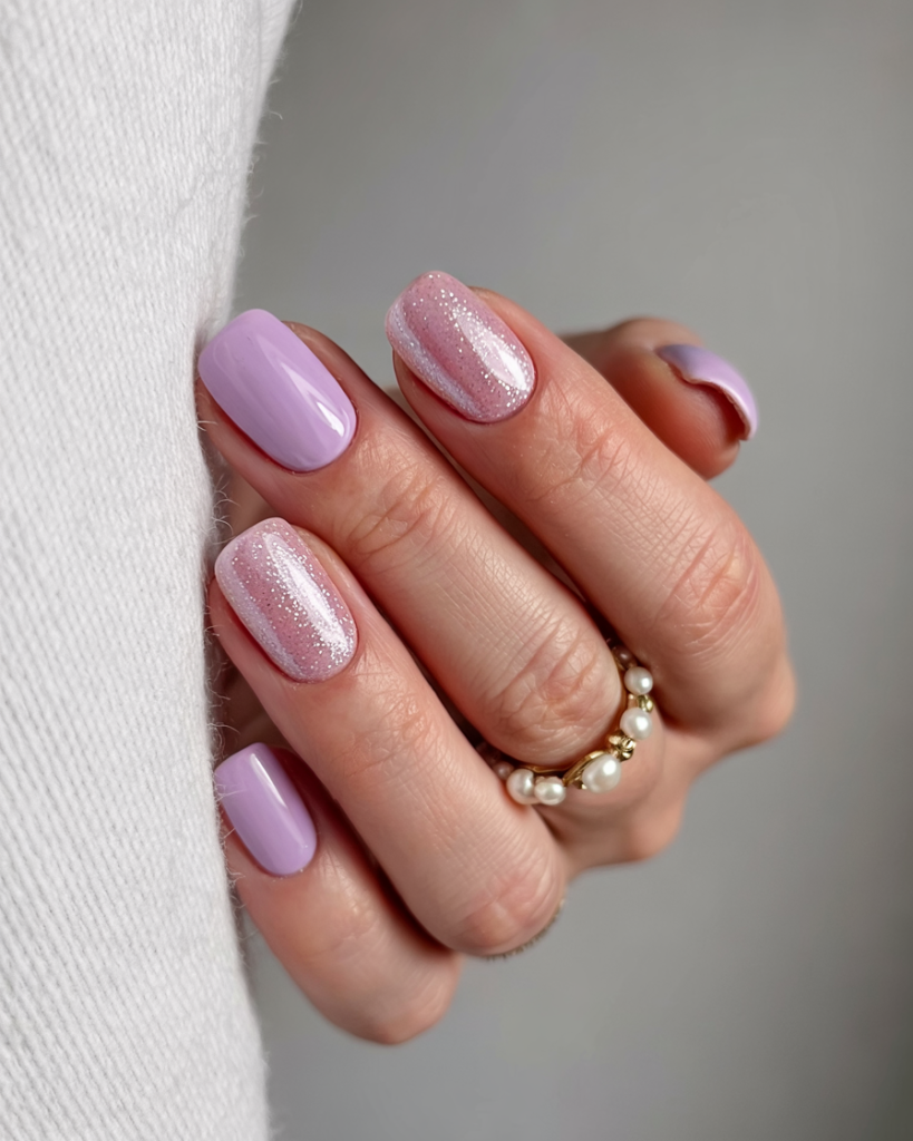 Sporty and well-groomed, this square-shaped short manicure combines tonal approach to cool lilac and sprinkle of glitter magic. It is the soft-dreamy nail-look by which you feel that you are walking fallen leaves in the lavender skies. The alternating nails have just the right amount of sparkles without dominating the calming color range.