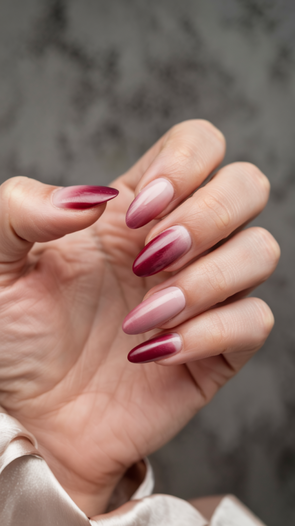 Such a almond nail set is like the fall transition itself – a soft gradient between pale pink and dark crimson, which reminds of the richness of autumnal sunsets. It is soft and dreamy as it seems like the colors are melting in one another. The shape is much more elegant and makes the fingers more elongated, so this impression is more adult and completely in-vogue in 2025.