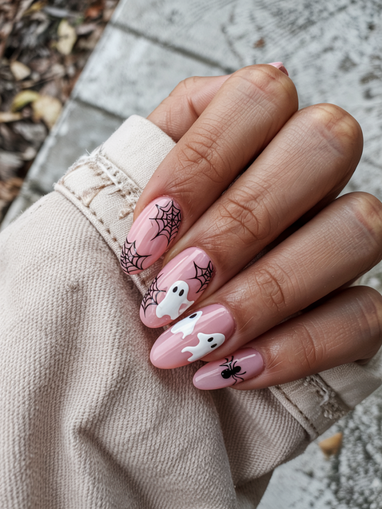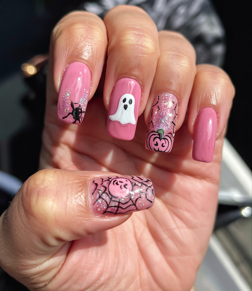 Halloween just got a lot more fabulous. Consisting of pink set products, this set makes spooky season sparkle season as it uses glitter, ghosts, pumpkins, and spiderwebs to finish in a classy blush background. It’s festive, cheeky, and still surprisingly wearable.