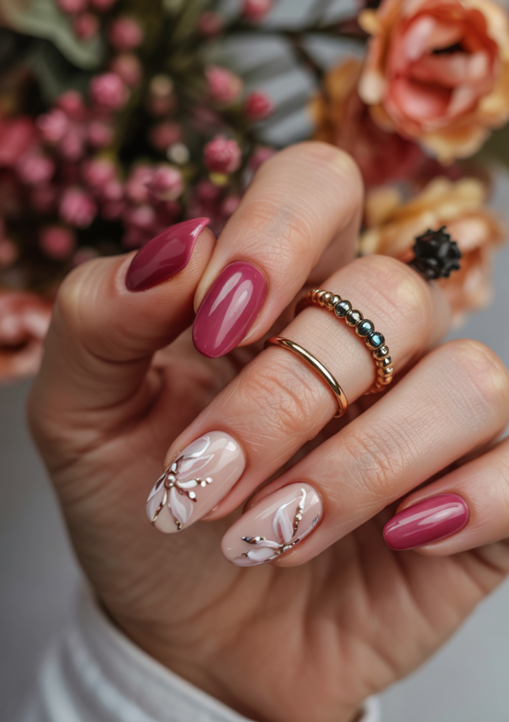 This autumn romance meets expressive art combination of blooming white art floral with a touch of design plum-colored glitter. The combo of the softer shade pale pink and the more pigmented accent nail is what truly makes the set pop, as it conveys a story, but does not have too much to say. It is girly but edgy such as a flowery dresses and hard boots.