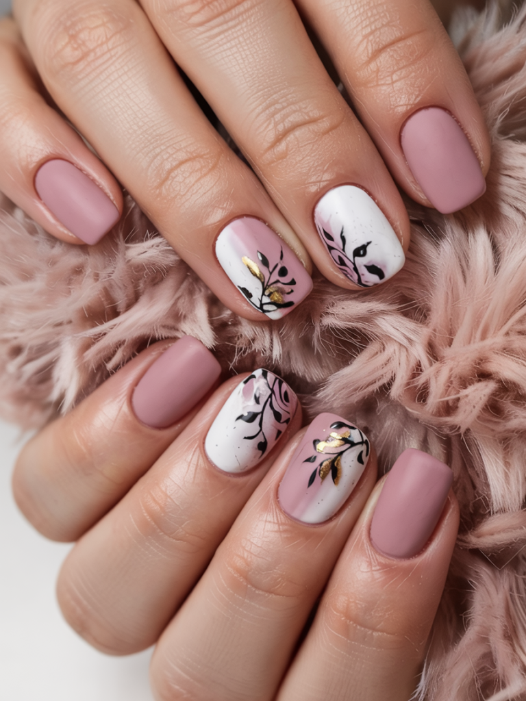 I dare say the pink+mauve manicure is something warm and welcoming. The autumnal coziness is introduced by the soft matte finish, and the beautiful contrast is brilliantly organized with the accent nails, whose hand-painted designs include the thin delicate black and gold artist-like drawings of the leaves upon the pale white. It is an October forest re-thought on your fingertips.