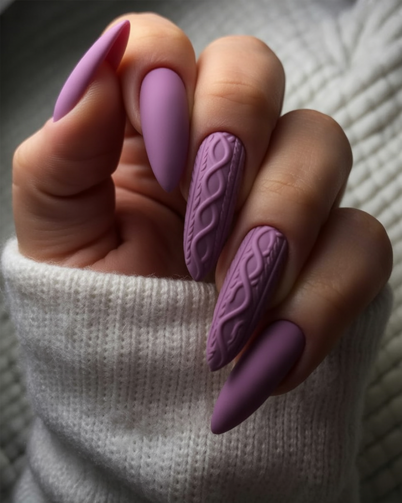 This matte plum is something undeniably cozy that immediately feels like your favorite fall sweater one, although, this favored garment item is on your nails. The complex pattern of the cable-knit art makes it a nostalgic tribute but with its almond shape, it is ever so trendy and slim. It is that nature of the design where you would like to enclose one`s hands around a cup of pumpkin spice latte and relax this fall in a fancy manner.