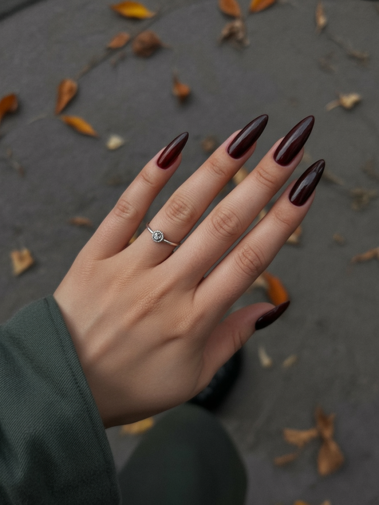 This dark luxurious burgundy finger nail color is fall chick in its finest form. This has some almond shape that gives it softness and the glossy finish due to its shiny finish that gives a rich yet a bit vampy feel. It’s dramatic but never overpowering—perfect for cool nights, leather jackets, and bold red lips.