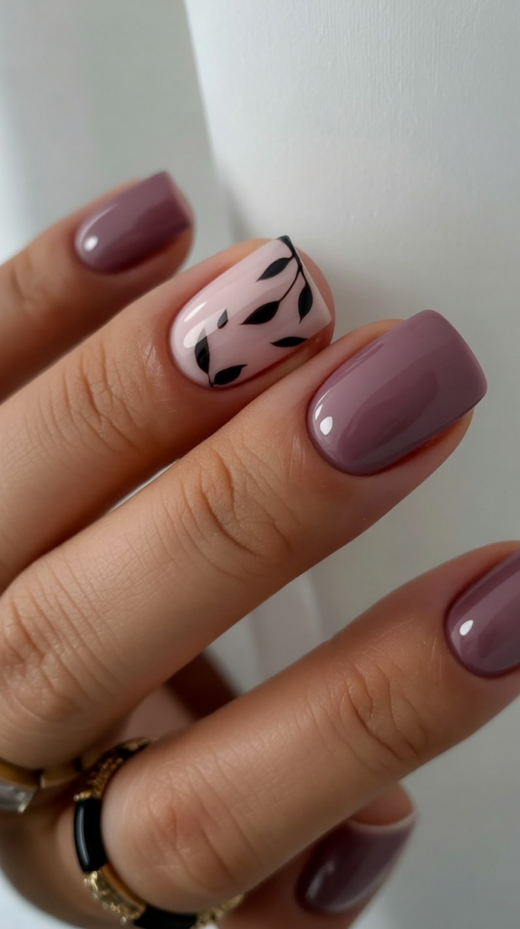 This is a light and gentle way to make a nod to fall without slipping into overdoing it: a muted plum and nude color palette with a light touch of leafiness. The branch in the ring finger is drawn by hand and adds an element of leaves and nature-related charisma-this appearance seems to be autumnal in your hands.