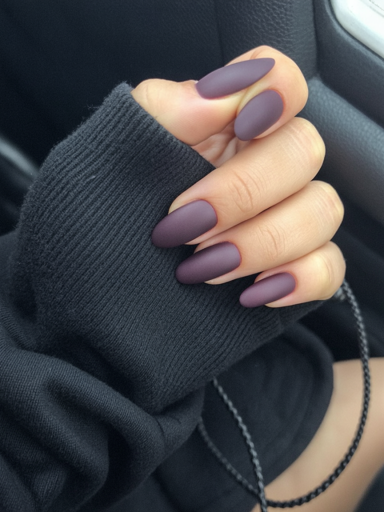 A matte plum manicure has something enigmatic, it is rather discreet, velvety, and deep. The appearance of this look reminds me of that first gray autumn day: brooding, fashionable, coffee-sipping under a comforter day. It is the kind of nail art that is not asking to be noticed, but everybody pays attention.
