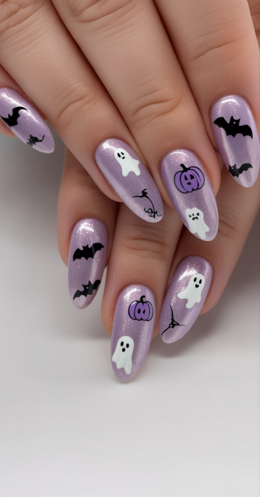 The ghostly feeling of this whimsical Halloween mani is established by a shiny lilac base on which little, hand-painted ghosts, bats, and pumpkins find their place. It is a little creepy but sweet Halloween reference. The sparkle base gives everything a magical twist.