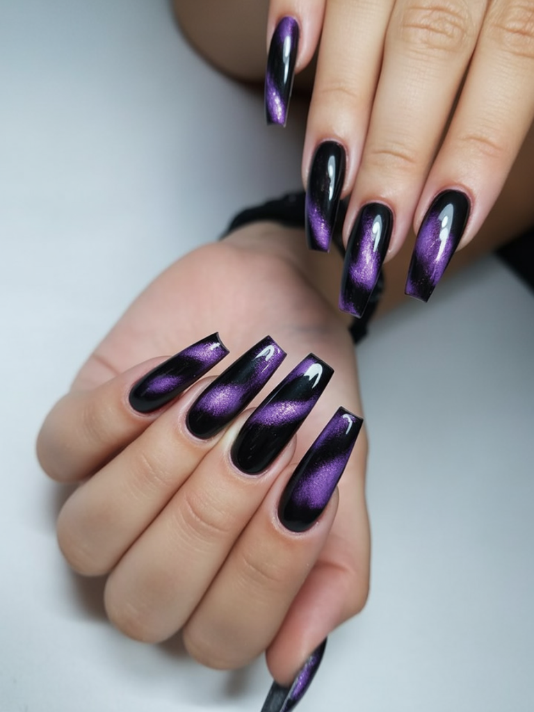 The style is mostly appropriate in longer coffin or taper square nails where the magnetic pigment can genuinely shine. It is ideal in case you are a female and yet you admire daring designs that can nevertheless be comfortable and cool as well. This should be on your list of purple fall nails that you have to try in 2025 should you want something cosmic like out of this world.