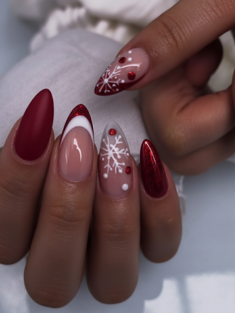 Consider this a rendition of holiday magic bottled into a single manicure. Deep red almond-shaped nails glisten with glitter accents, while delicate white snowflake designs bring in a touch of winter wonder. Alternating between bold solid colors and glossy finishes, this look manages to be festive yet chic-just like a perfect red dress you wear only for your December parties. Cheerful, lovely, and exactly the right blend of cozy and glam.