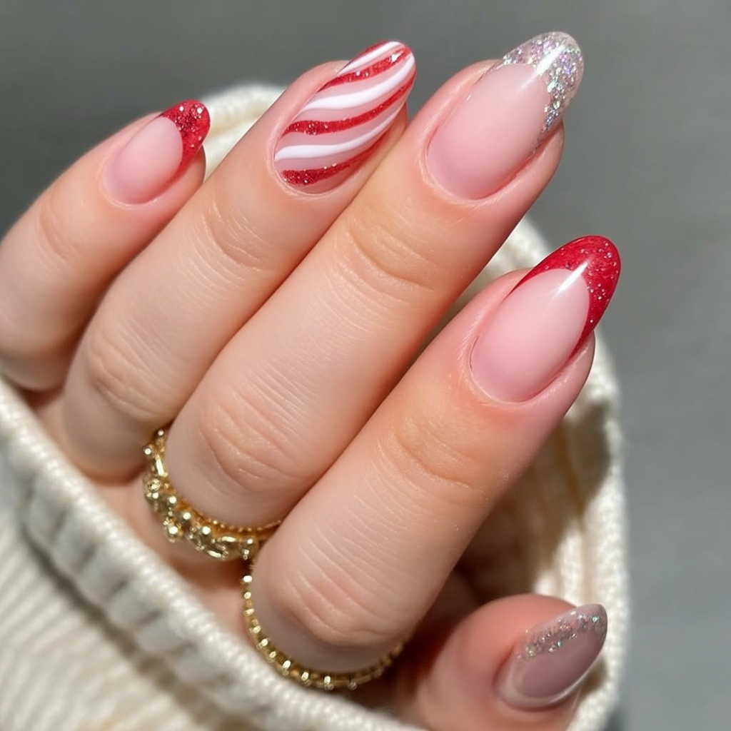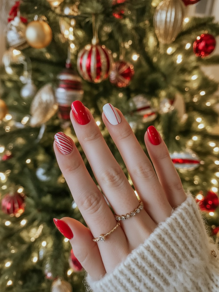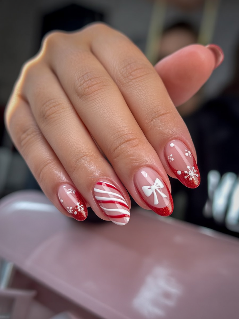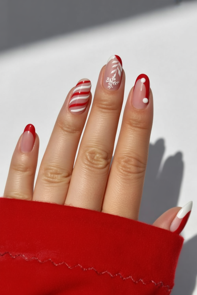 This manicure works best for women who like experimenting with color while staying elegant in an almond shape. The mix of red, green, and white feels seasonal but unexpected, making it a conversation starter. It pairs well with both cozy loungewear and more dressed-up holiday looks, adding a touch of joyful creativity.