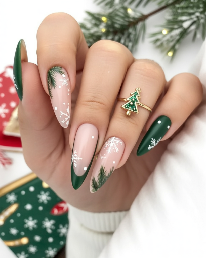 These nails feel like Christmas brought to life with deep green polish, holly leaves, and crisp white snowflakes. The mix of matte and glossy finishes gives them dimension, while the almond shape keeps the look elegant. It’s festive, bold, and perfect for anyone who loves traditional holiday vibes.