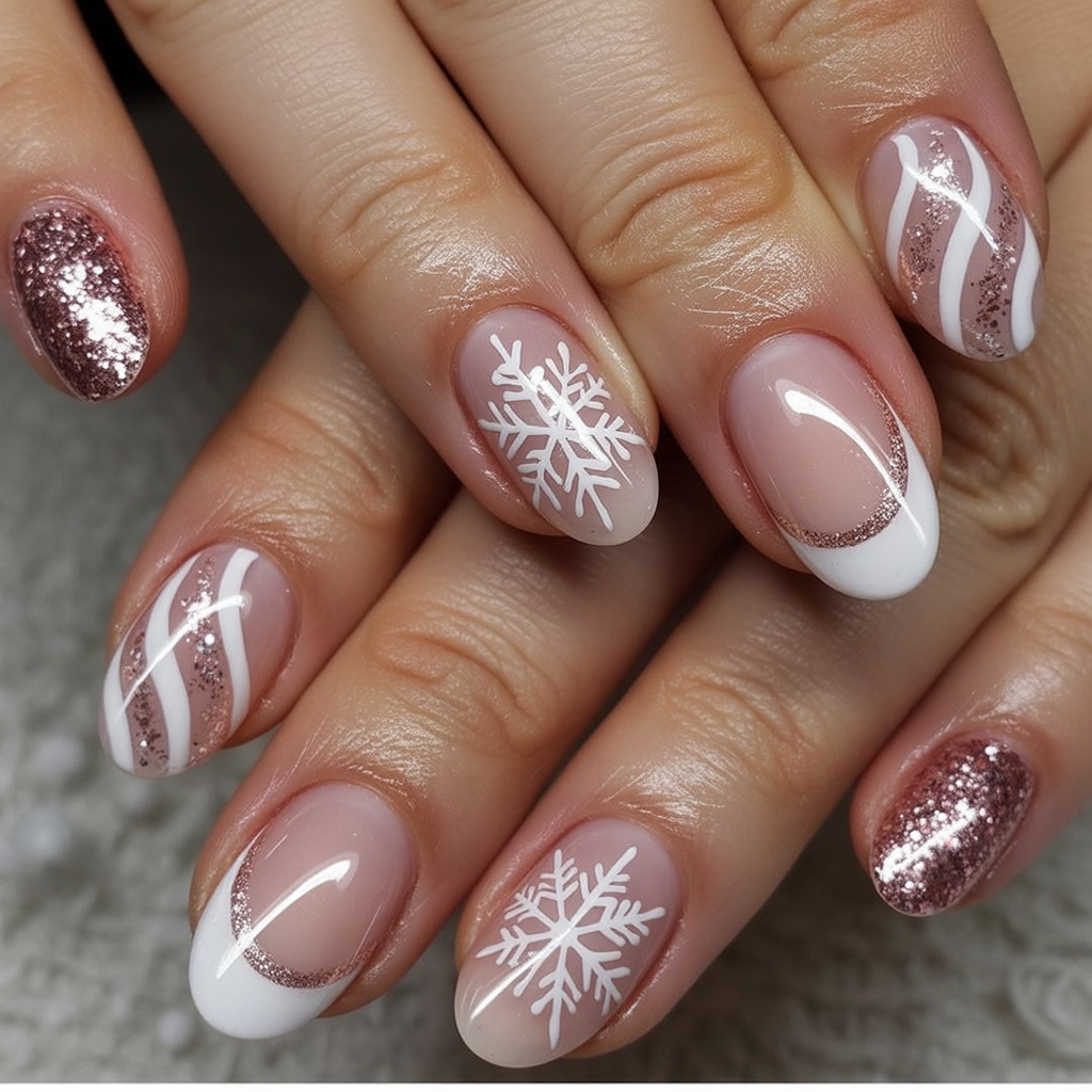 This is how you bring the dreamy elegance of rose-gold glitter, brittle white French tips, and snowflakes into the season: A perfect contrast so that between sparkle and discretions, nail designs are in a posture that feels well and festive at once. Like frosted ornaments at your fingertips.
