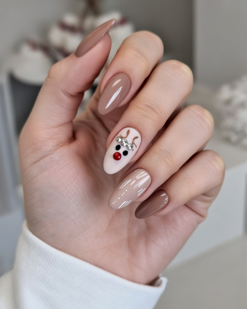 14. Reindeer Accent Almond Nails