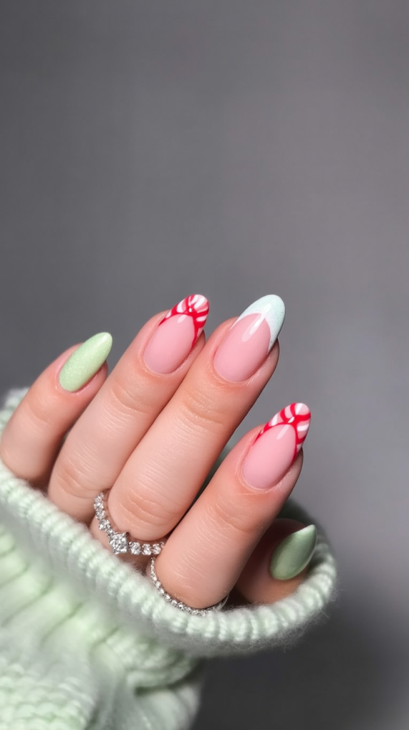 Fresh and fun, these nails mix red and white peppermint swirls with a soft pastel green for a surprising twist on holiday style. The combination feels modern yet still festive, like a playful update to traditional Christmas colors. It’s cheerful, colorful, and effortlessly stylish.