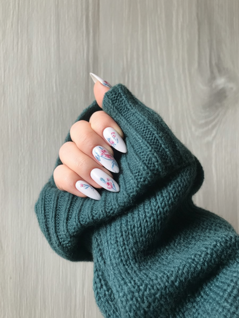 These white almond nails are soft and dreamy and decorated with delicate floral art in pink and blue. They resemble winter blooms on frosted glass, making for a romantic and whimsical seasonal statement. The look is feminine, distinct, and subtly festive.