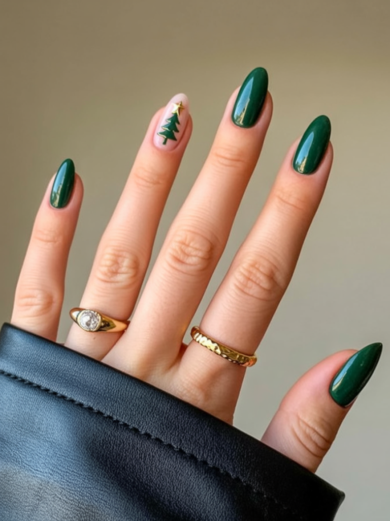 18. Classic Green Almond Nails with Christmas Tree Accent