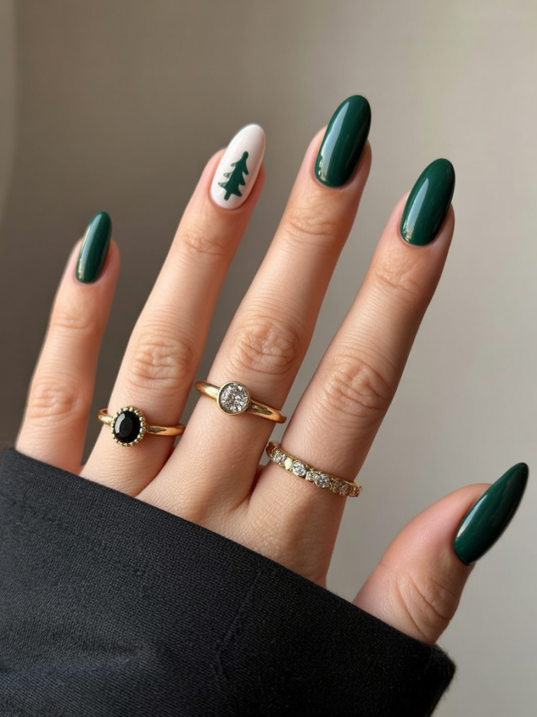 Bold green nails with a minimalist Christmas tree accent nail create a look that’s festive yet chic. The dark green polish is classy and glossy, while the little golden star atop the tree gives just a little sparkle. It’s festive without being loud and effortlessly stylish.