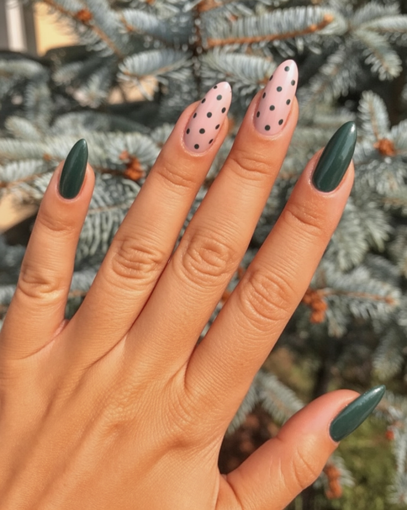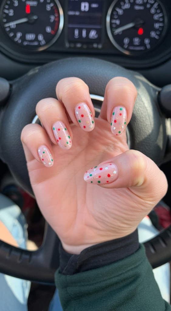 This design is an excellent choice if you want shorter almond-shaped nails or something subtle but still festive. The dots are simple to handle and won’t make an overwhelming mess, making them suitable for everyday wear during the holiday season. They speak effortless holiday chatter when glided into casual sweaters or party outfits.