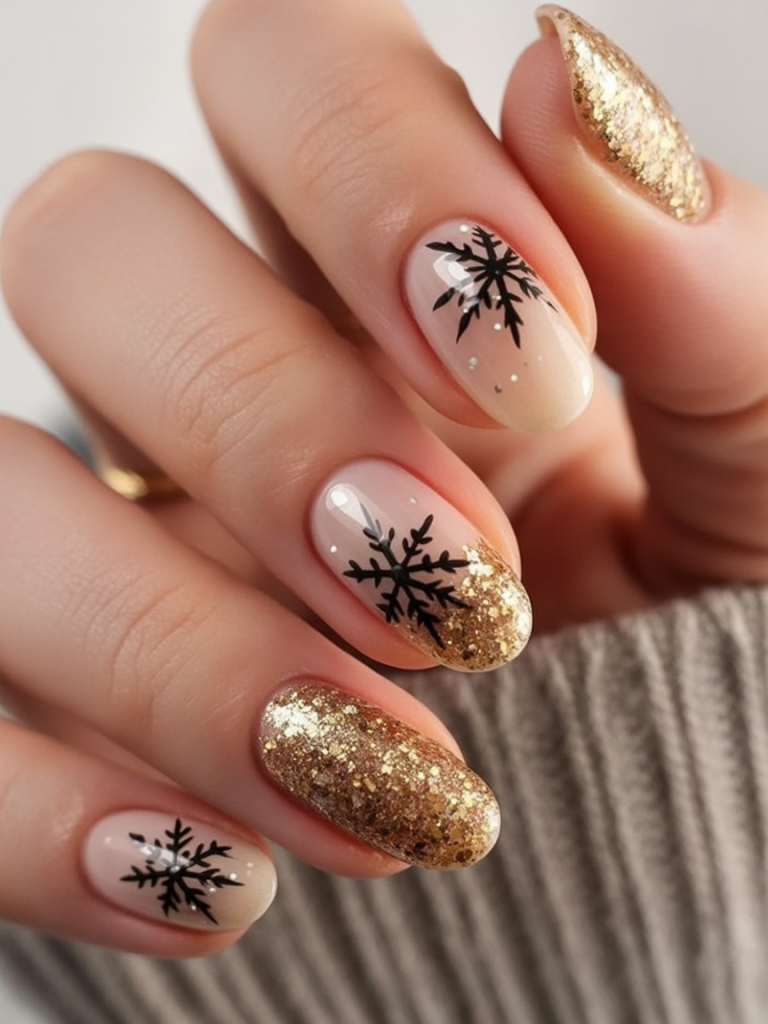 This is a perfect glam take on Christmas, with golden glitter tips decorated with bolder-than-life black snowflakes. The combo feels audacious, joyous, and classy—the look is akin to shimmering holiday lights against the velvety backdrop of a starry night. It is for you if you love to sparkle but wish to be chic and different at the same time.