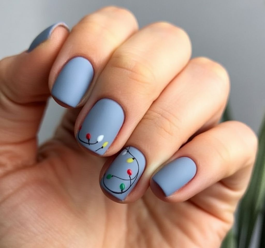 Soft matte blue nails get their festive touch from the playful string light details in red, green, yellow, and white. The look is whimsical yet modern, perfect for capturing the cozy glow of Christmas evenings. It is cheerful, full of creative energy, and reminiscent of childhood joy.